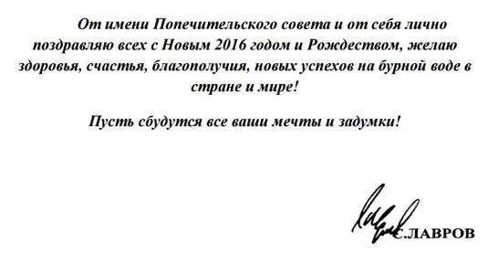 От имени Попечительского совета и от себя лично поздравляю всех с Новым 2016 годом и Рождеством, желаю здоровья, счастья, благополучия, новых успехов на бурной воде в стране и мире!