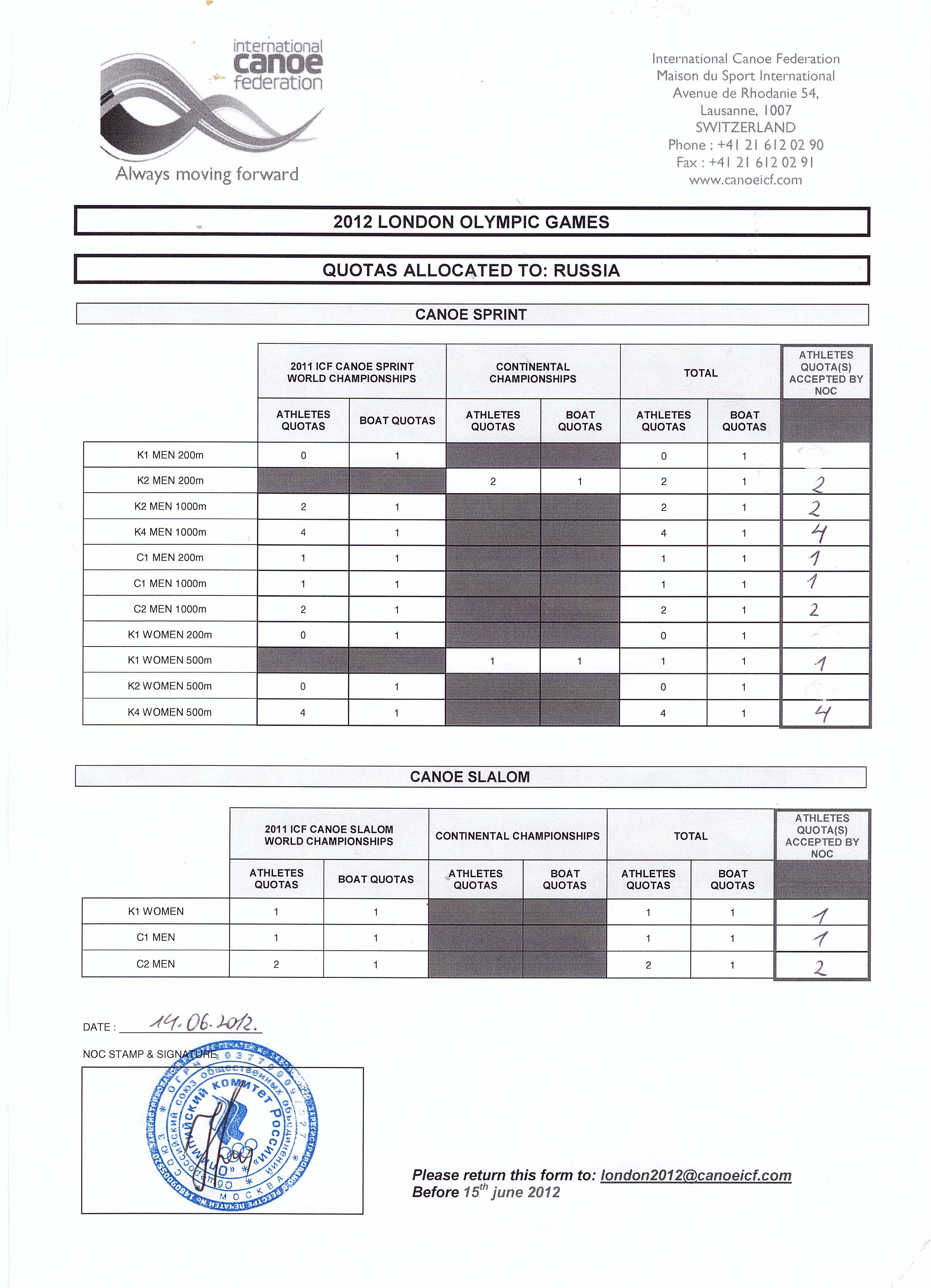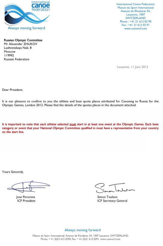 Официальное письмо из ICF с подтверждением участия российской сборной в Олимпиаде в Лондоне 2012 в соотвествии с квотами.