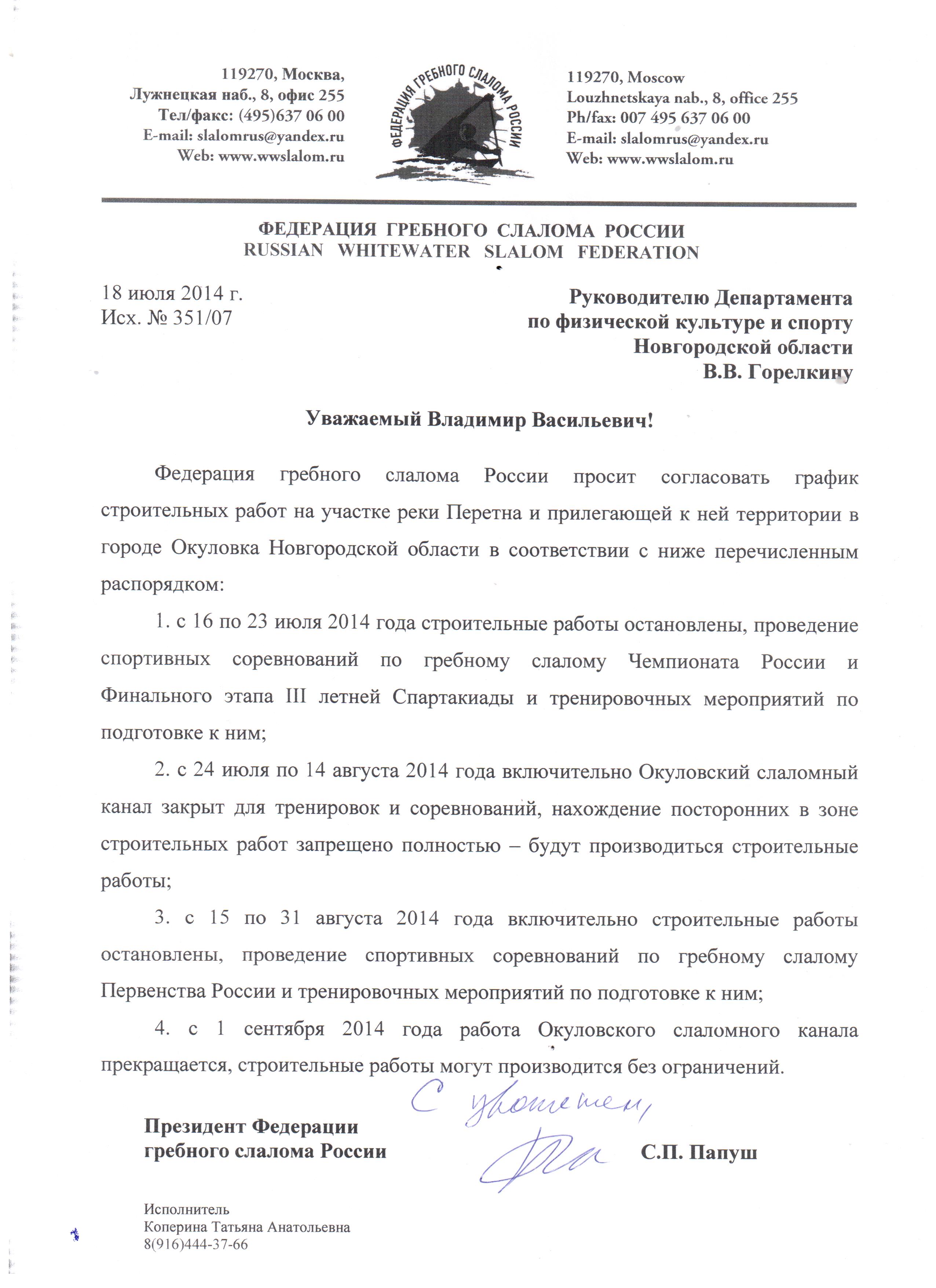 1. с 24 июля по 14 августа 2014 года включительно Окуловский слаломный канал закрыт для тренировок и соревнований, нахождение посторонних в зоне строительных работ запрещено полностью – будут производиться строительные работы;