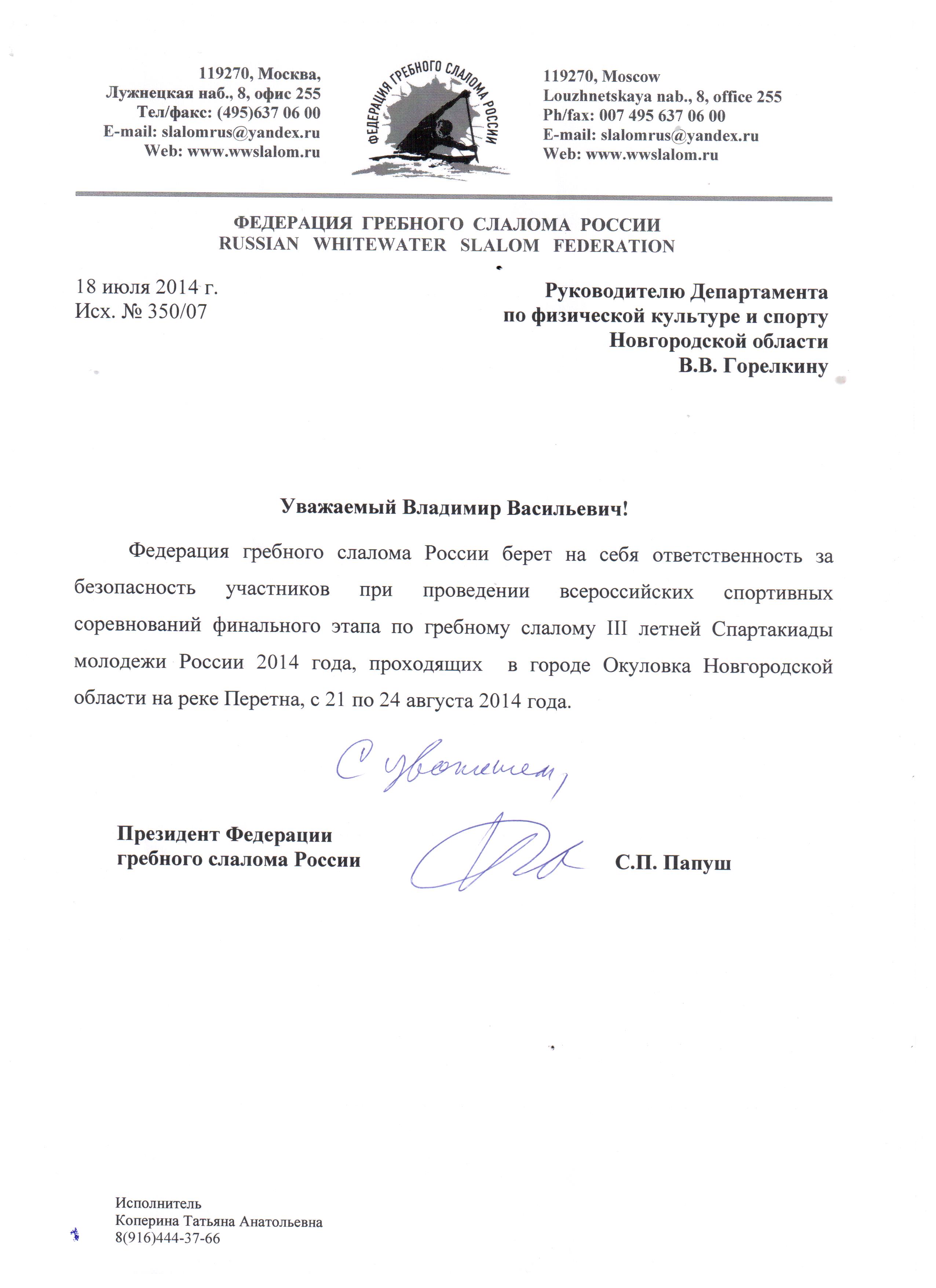 Федерация гребного слалома России (ФГСР) доводит до сведения тренеров и представителей команд информацию о том, что: