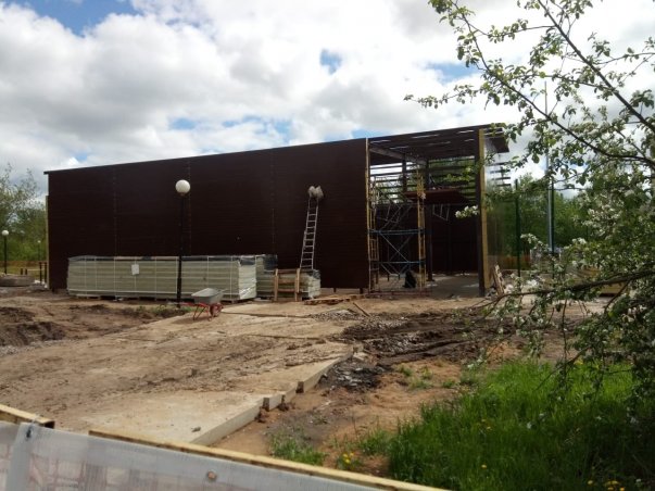 Строители, облагораживающие базу гребного слалома на реке Сходня в Москве не перестают работать даже в праздники. В эти дни они обнесли каркас здания стенами.