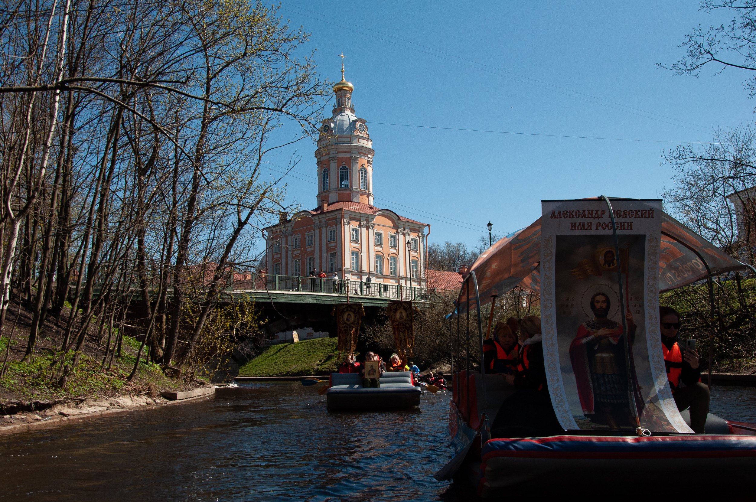 Как и предполагалось мы вместе с настоятелем Александро-Невской Лавры Назарием совершили Крестный ход, как это положено по территории храма, а затем впервые для Лавры прошли по воде: это речка Монастырка, Обводной канал и Нева. Три водные артерии, которые омывают остров, где расположена Александро-Невская Лавра. Мы прошли на "диванном флоту" Комплекса активного отдыха "Угребись" совместно с нашими друзьями, гребцами, представленные клубом "Ижора", канополистами во главе с Александром Петрашовым и каноистами,